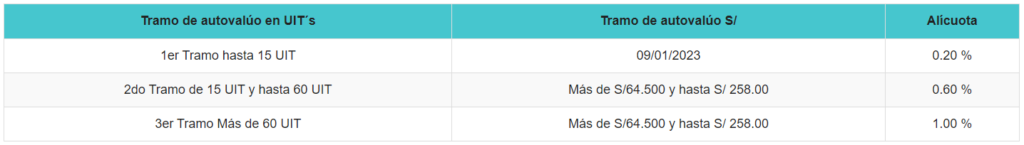 La base imponible está constituida por la suma del valor de los predios del contribuyente en el distrito. Esto quiere decir que cuando un contribuyente debe pagar el tributo por varios predios ubicados en el mismo distrito, no se realiza una determinación individual por cada uno, sino que se toma en conjunto el valor de todos, y solo sobre la suma total obtenida se efectúa la liquidación del monto que ha de pagar. Sobre esta base imponible se aplica la siguiente escala progresiva acumulativa.